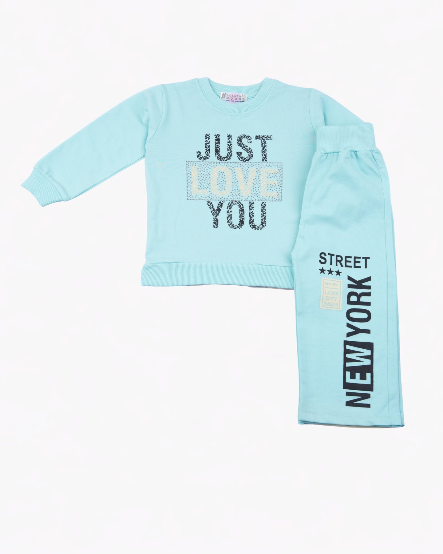 The blue crewneck features the statement text “JUST LOVE YOU” in a mixed graphic design, creating a standout look. It’s paired with matching pants detailed with “NEW YORK” and “STREET” text along the leg for an urban-inspired finish. Designed for easy wear and all-day comfort, this set is perfect for everyday outings or relaxed play.