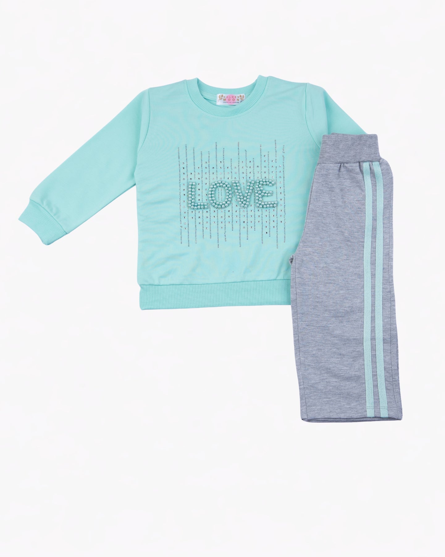 The blue crewneck features the word “LOVE” in a sparkling vertical-line design, adding a soft shine to a cozy essential. It’s paired with heather grey jogger pants accented with mint side stripes for a sporty, coordinated look. Perfect for playtime, outings, or relaxing at home, this set keeps your baby girl comfy and adorable all day long.