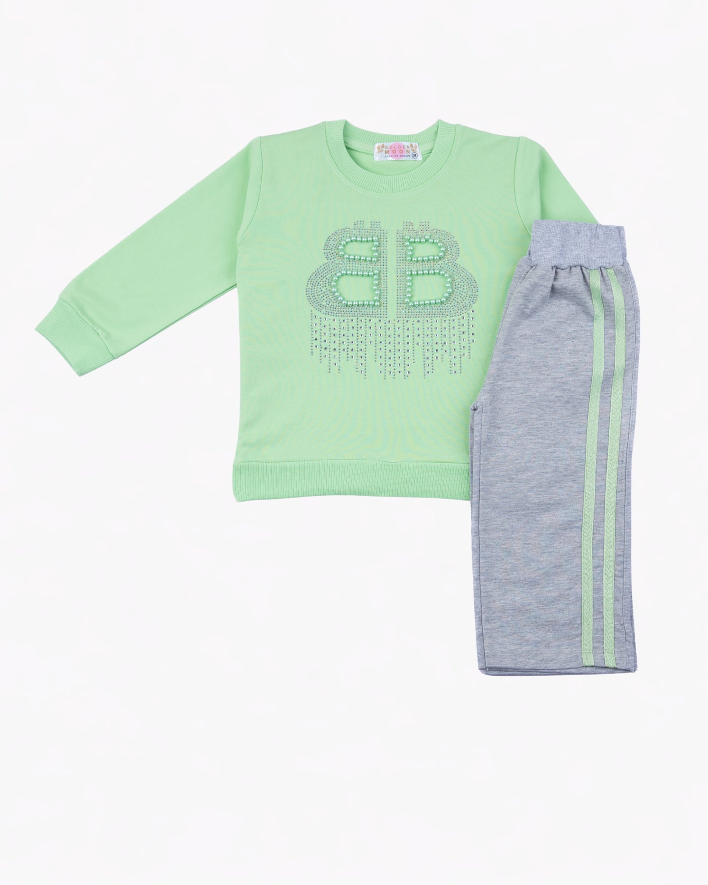 This adorable two-piece set features a mint green long-sleeve crewneck highlighted with a sparkling “BB” embellished design that adds a touch of shine and charm. It’s paired with soft heather grey pants detailed with matching mint side stripes for a cute, sporty finish. Designed for comfort and style, this outfit is perfect for playtime, casual outings, or cozy days at home.