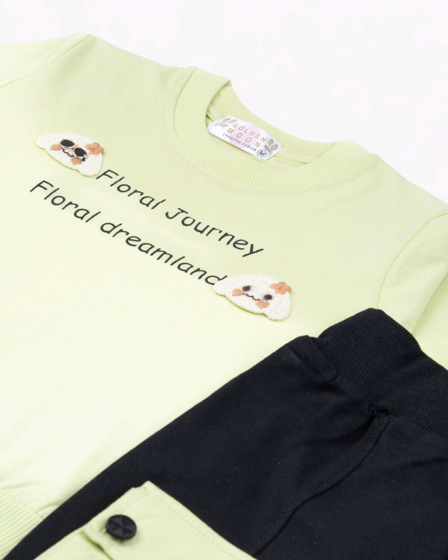 The lime green crewneck features the text “A Friend Journey, Friend Dreaming” with small playful character details. It is paired with classic black pants highlighted by a matching green contrast pocket for a stylish, coordinated look. Perfect for everyday wear, this set keeps your baby girl comfy while adding a charming touch to her outfit.