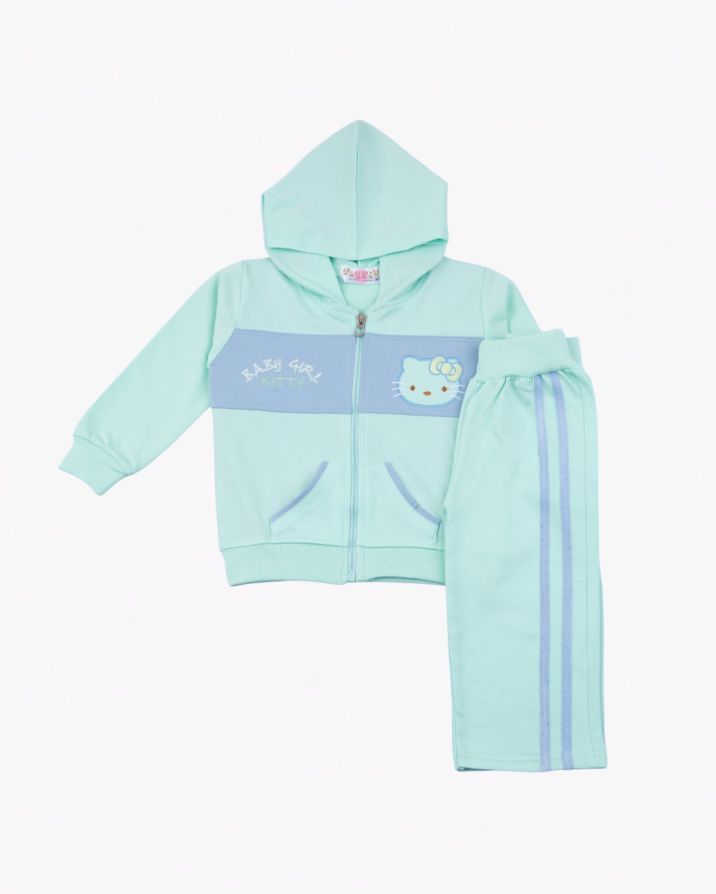 This cozy and stylish two-piece set is perfect for everyday comfort with a cute, sporty touch. The mint green zip-up hoodie features a color-block panel with a sweet character graphic and playful text detail, paired with matching pants designed with contrast side stripes. Soft and easy to wear, this set is ideal for outings, playtime, or lounging in comfort.