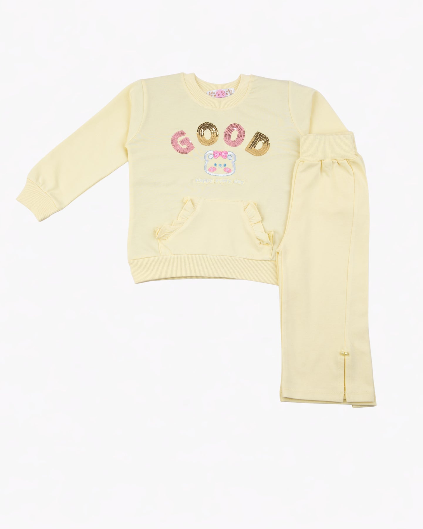 This yellow crewneck features the word “GOOD” with a cute bear graphic detail, adding charm to an everyday essential. It’s paired with matching yellow pants finished with subtle accents for a clean, coordinated look. Perfect for playtime, outings, or cozy days at home.