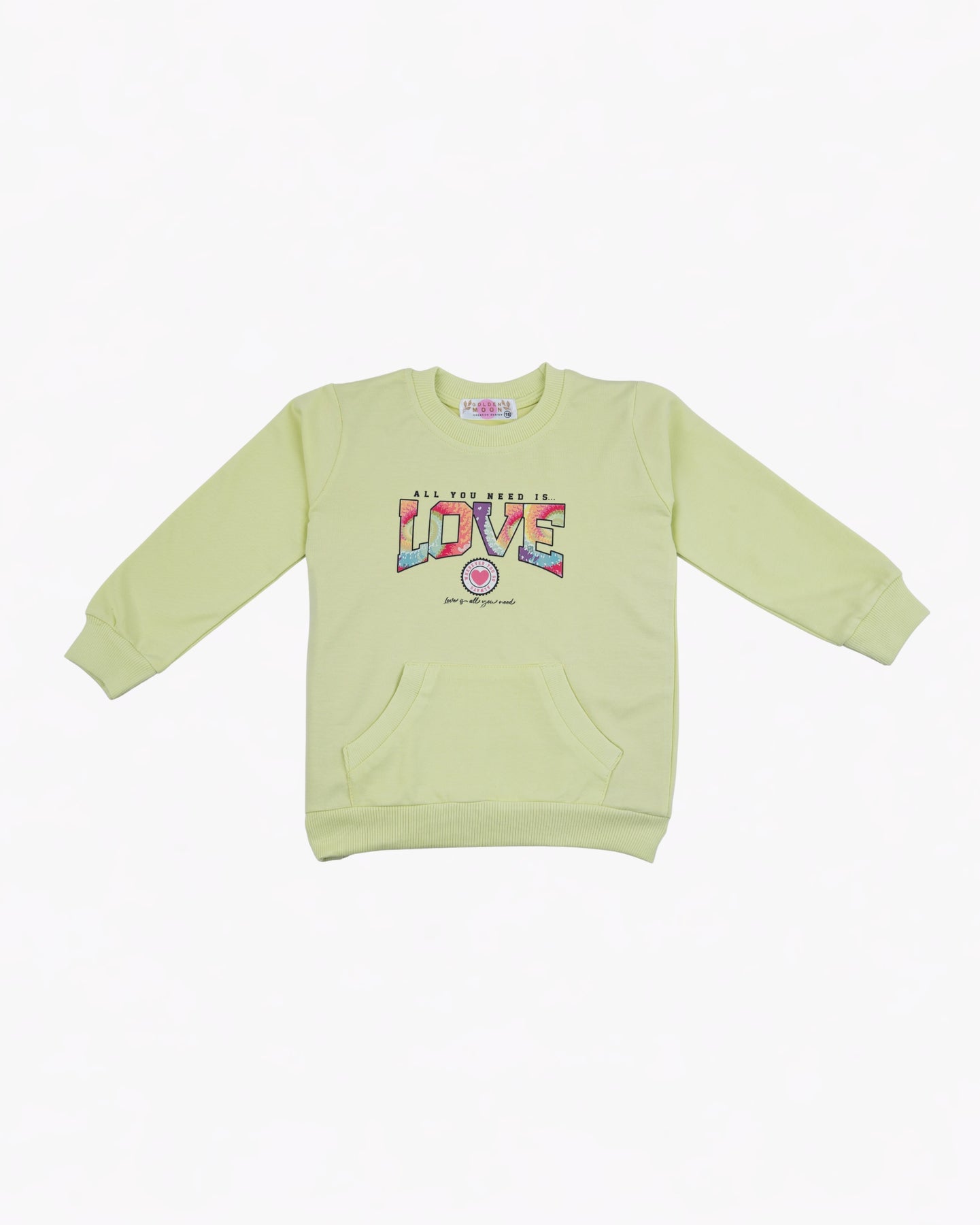 This adorable crewneck sweatshirt features a colorful “Love” text graphic with a sweet heart detail, adding a cheerful and playful touch to your baby girl’s outfit. Designed with long sleeves, a front kangaroo pocket, and ribbed trims, it offers cozy warmth and everyday comfort. Perfect for playtime, outings, or relaxed days at home.